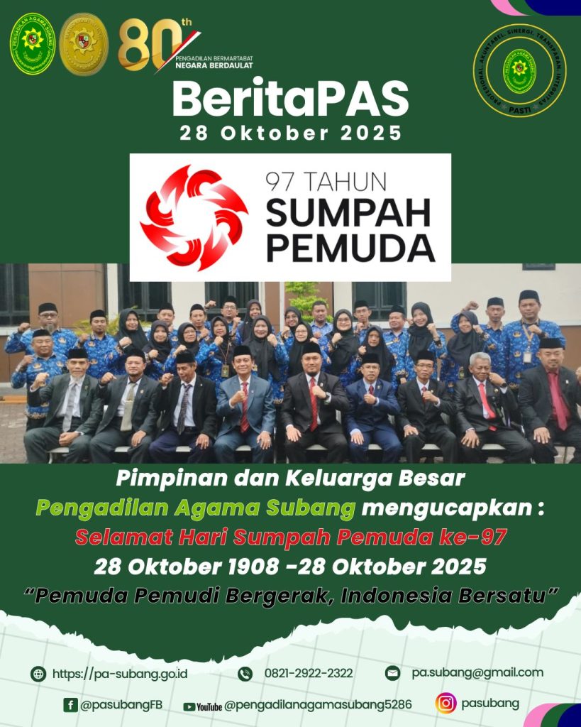 Pimpinan dan Keluarga Besar Pengadilan Agama Subang mengucapkan : Selamat Hari Sumpah Pemuda ke-97 28 Oktober 1908 -28 Oktober 2025 “Pemuda Pemudi Bergerak, Indonesia Bersatu”