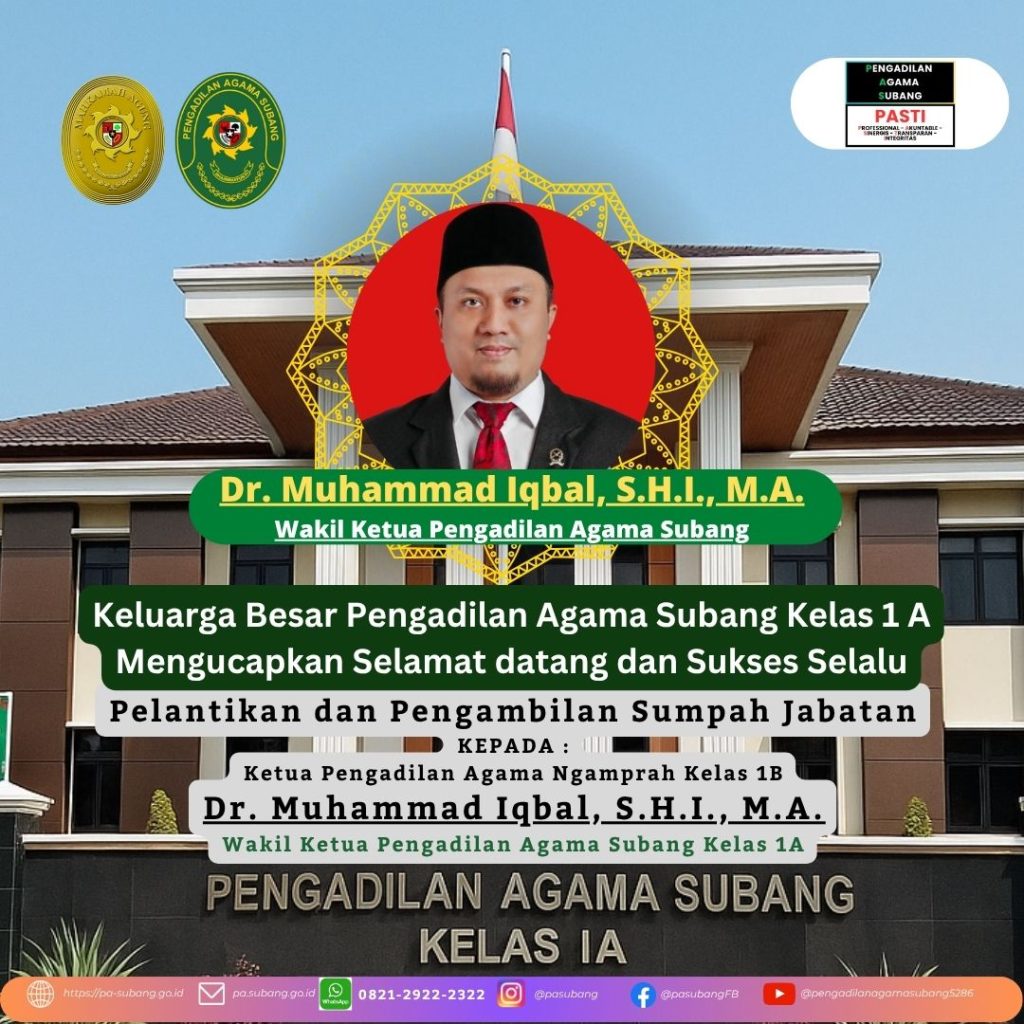 Selamat dan Suksesatas Pelantikan dan Pengambilan Sumpah JabatanDr. Muhammad Iqbal, S.H.I., M.A.sebagai Wakil Ketua Pengadilan Agama Subang Kelas 1A