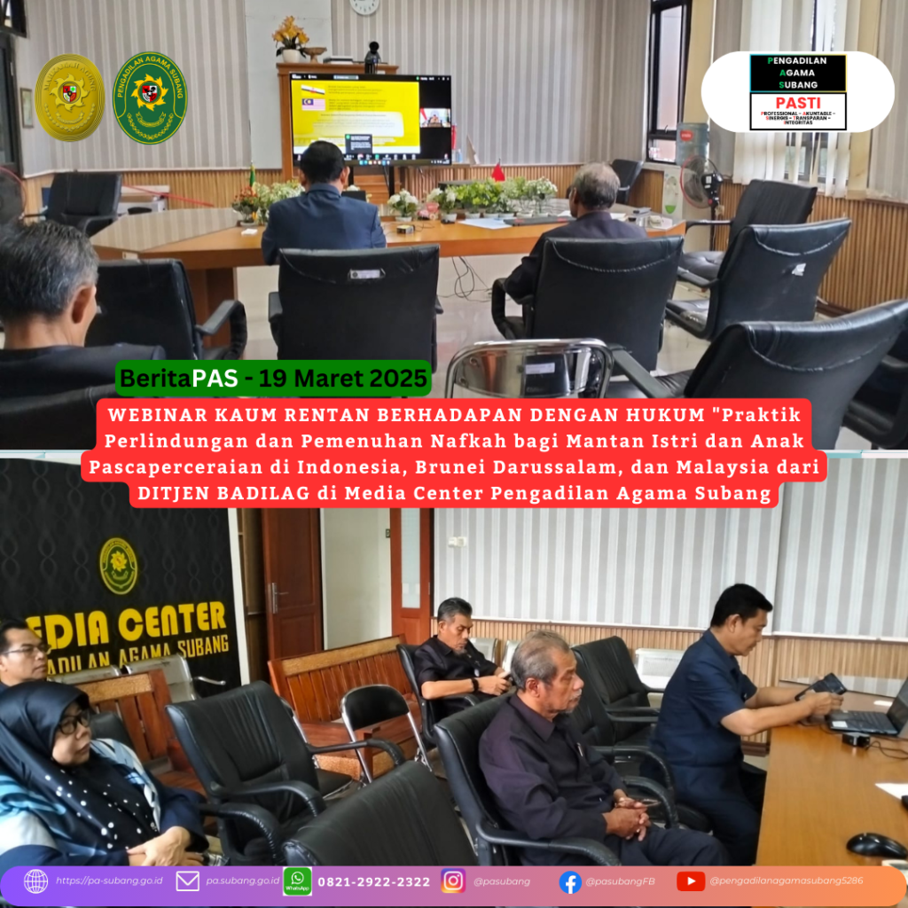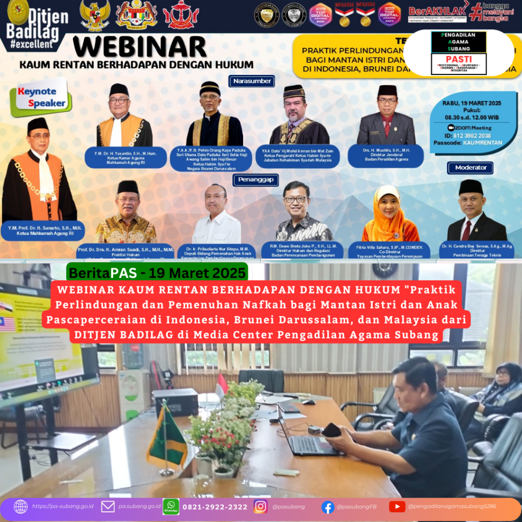WEBINAR KAUM RENTAN BERHADAPAN DENGAN HUKUM “Praktik Perlindungan dan Pemenuhan Nafkah bagi Mantan Istri dan Anak Pascaperceraian di Indonesia, Brunei Darussalam, dan Malaysia dari DITJEN BADILAG di Media Center Pengadilan Agama Subang